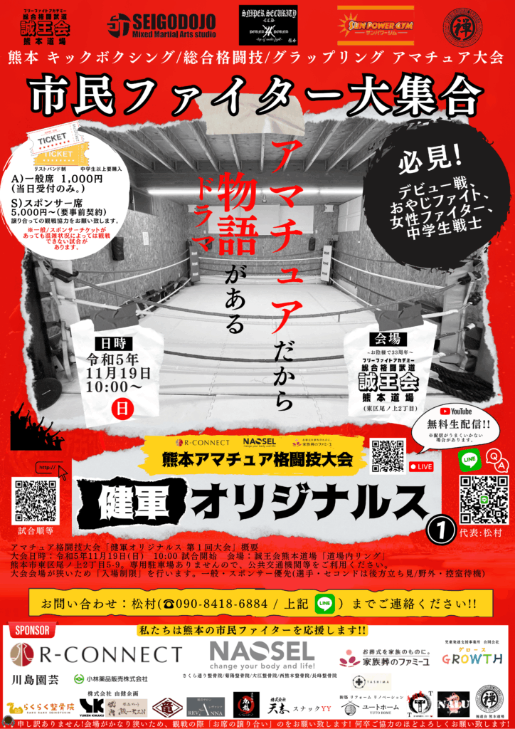【更新】健軍オリジナルスポスター(10/12時点) 熊本アマチュア格闘技大会「健軍オリジナルス」関連 コピー 2023.10.122025.10.26 第一回アマチュア格闘技大会「健軍オリジナルス」ですが、ありがたいことにスポンサー様が増えております。 大会にご賛同いただき誠にありがとうございます。