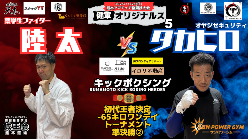 【14試合目】✕陸太(誠王会熊本道場) vs. タカヒロ(SUN POWER GYM) 〇 判定0-3【-65kg トーナメント準決勝 2分×2R】