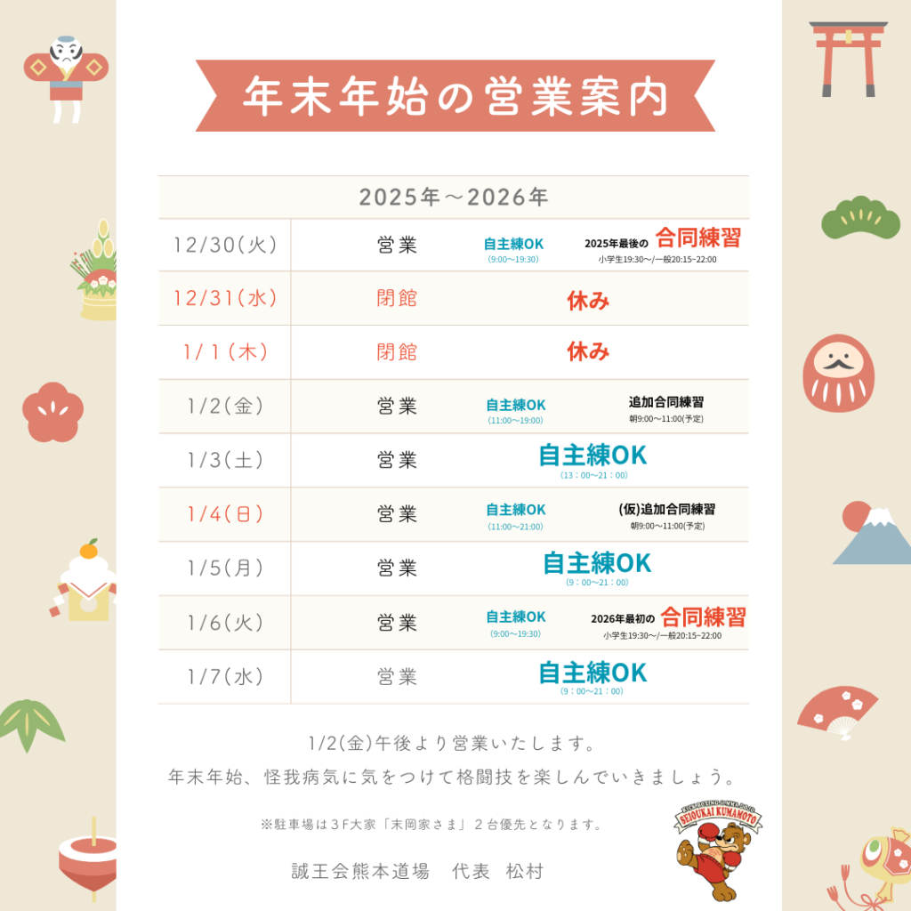 ※引き続き、誠王会熊本道場の「正クラス」「KIDS格闘技クラス」への入会希望の方は気軽にご相談ください。